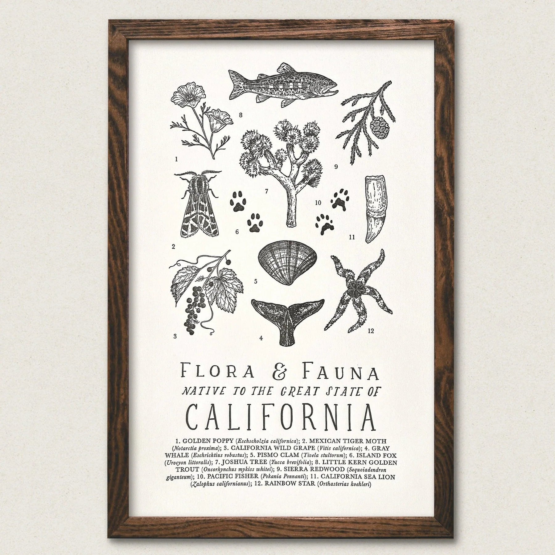 A hand-illustrated letterpress chart detailing flora and fauna native to the Great State of California. This guide features wildlife including the Golden Poppy, Joshua Tree, California Sea Lion, and Sierra Redwood.