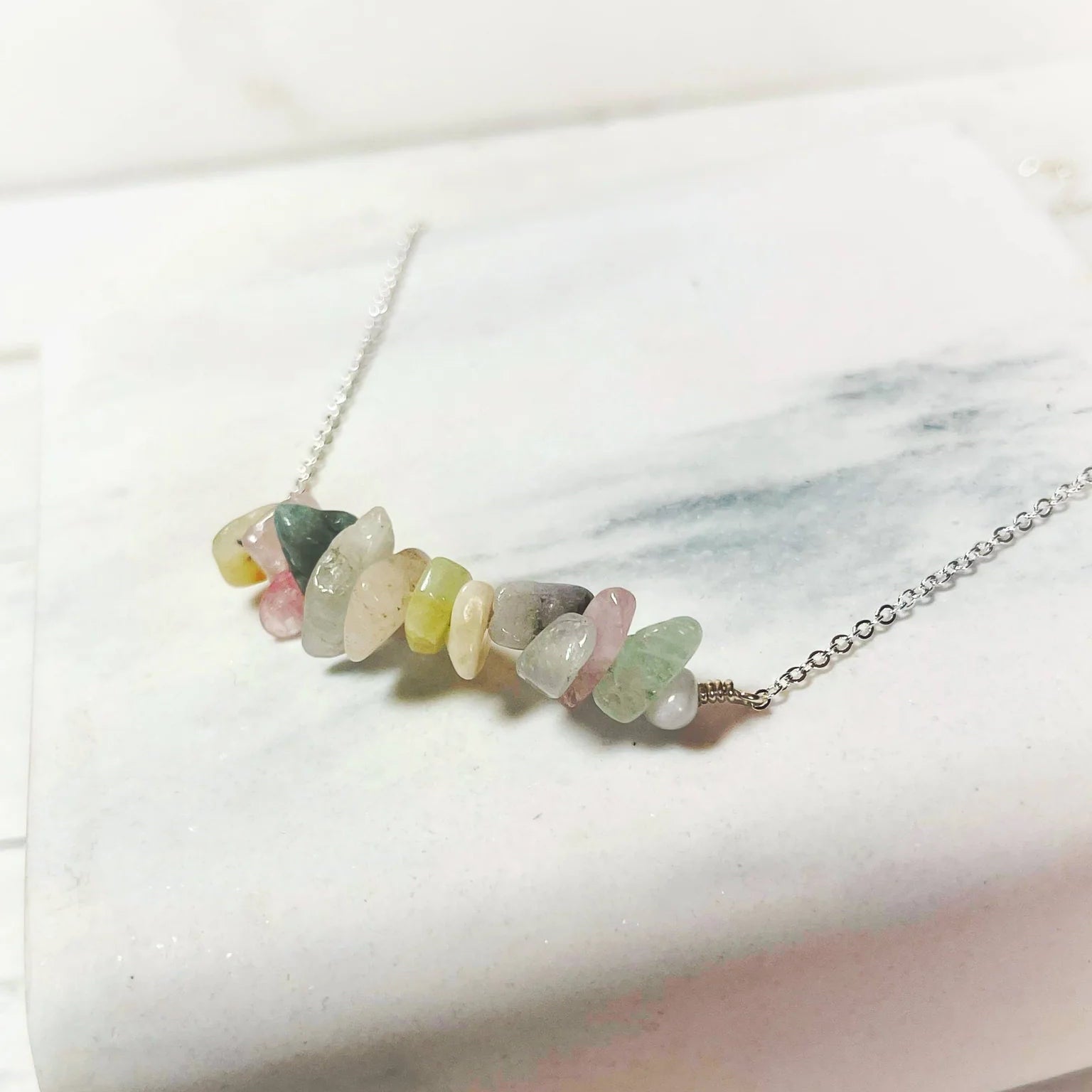 Hand wire-wrapped morganite chips on a chain. The chain is 18" and the gemstone centerpiece is approx. 2" wide. Due to the nature of the stones, each necklace will vary slightly in colors as no two chips are alike, making it a one of a kind piece!