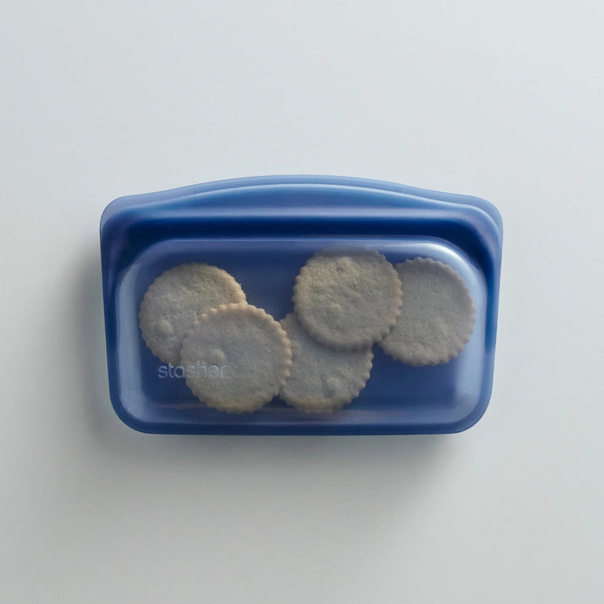 The Snack Stasher bag is the perfect reusable container for bite-sized travel food and home organization. Fill with trail mix, cookies, paper clips, pens or pencils, pet treats, or anything worth keeping neat and dry. Made of platinum food-grade silicone, the Snack Stasher bag contains no harmful chemicals and is both freezer and microwave safe. Featuring a patented Pinch-Loc seal, this size fits most mobile devices and is touchscreen compatible.