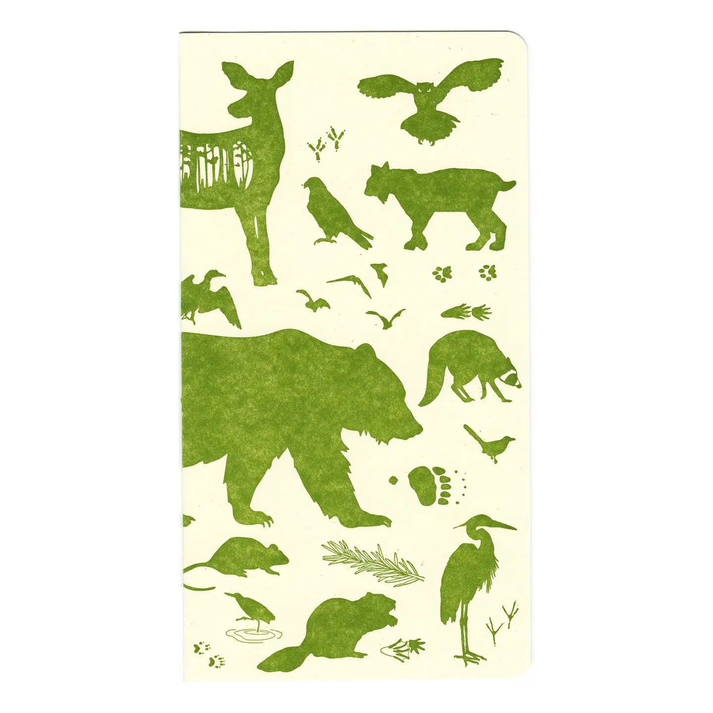 8 fill-in months and 28 fill-in weeks. The cover is letterpress printed in ink with original illustration on 100# paper. 64 100% recycled pages, opens flat. Sewn stitched binding on the left in coordinating thread. Measures 4.25”x8” with two rounded corners. Front page lists Moon names & phases + ruler. Pocket on inside back cover with 2 calendar years reference included. 3 dotted grid pages in the back.